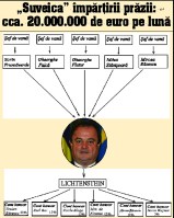 Revenind la prima jumătate a şpăgilor centralizate în vămile de frontieră, din suma de 20 de milioane de euro exportată lunar, firma din Lichtenstein care se ocupa în exterior de operaţiunea de alimentare a conturilor oprea 5% ca plată pentru servicii, iar apoi banii erau împărţiţi. Şi acum, partea cea mai interesantă: contul lui Traian Băsescu primea regulat 20% din sumă, cele ale lui Emil Boc şi Vasile Blaga cîte 15%, 10% intra în contul ministrului de Finanţe, 5% în contul şefului ANAF, Sorin Blejnar, cîte 5% mergea către conturile baronilor PDL implicaţi în operaţiune (respectiv Gheorghe Flutur, Gheorghe Falcă, Sorin Frunzăverde şi Mihai Stănişoară), iar 10% în contul lui Mircea Băsescu, pe principiul că Portul Constanţa avea cel mai important aport la operaţiune. Pentru a avea o imagine de ansamblu cît mai completă, trebuie menţionat că în aceste colecte de „bani negri“ nu intrau operaţiunile de mare evaziune fiscală, care, în general, sînt efectuate de anumiţi oameni de afaceri agreaţi de Putere, unde şpaga are tarife mult mai mari, negociate special, iar operaţiunile sînt realizate la vămile de interior ale României, unde are loc întocmirea actelor.