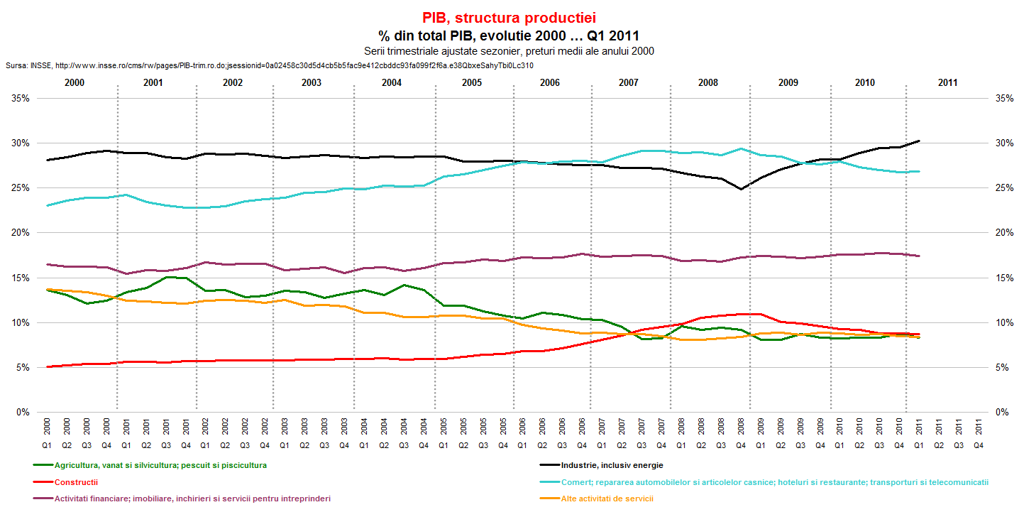 De data asta, chiar cǎ date înainte de 2000 nu am gǎsit, deci ne folosim și noi de cele puse de INS la dispoziție. Momentul de plecare al analizei: 2000. Cea mai recentǎ datǎ a seriei temporale: trimestrul I 2011. Seria de date utilizatǎ este cea ajustatǎ sezonier și care a dat la o parte efectul inflației, totul fiind calculat în prețuri constante, ale anului de început al seriei: 2000.