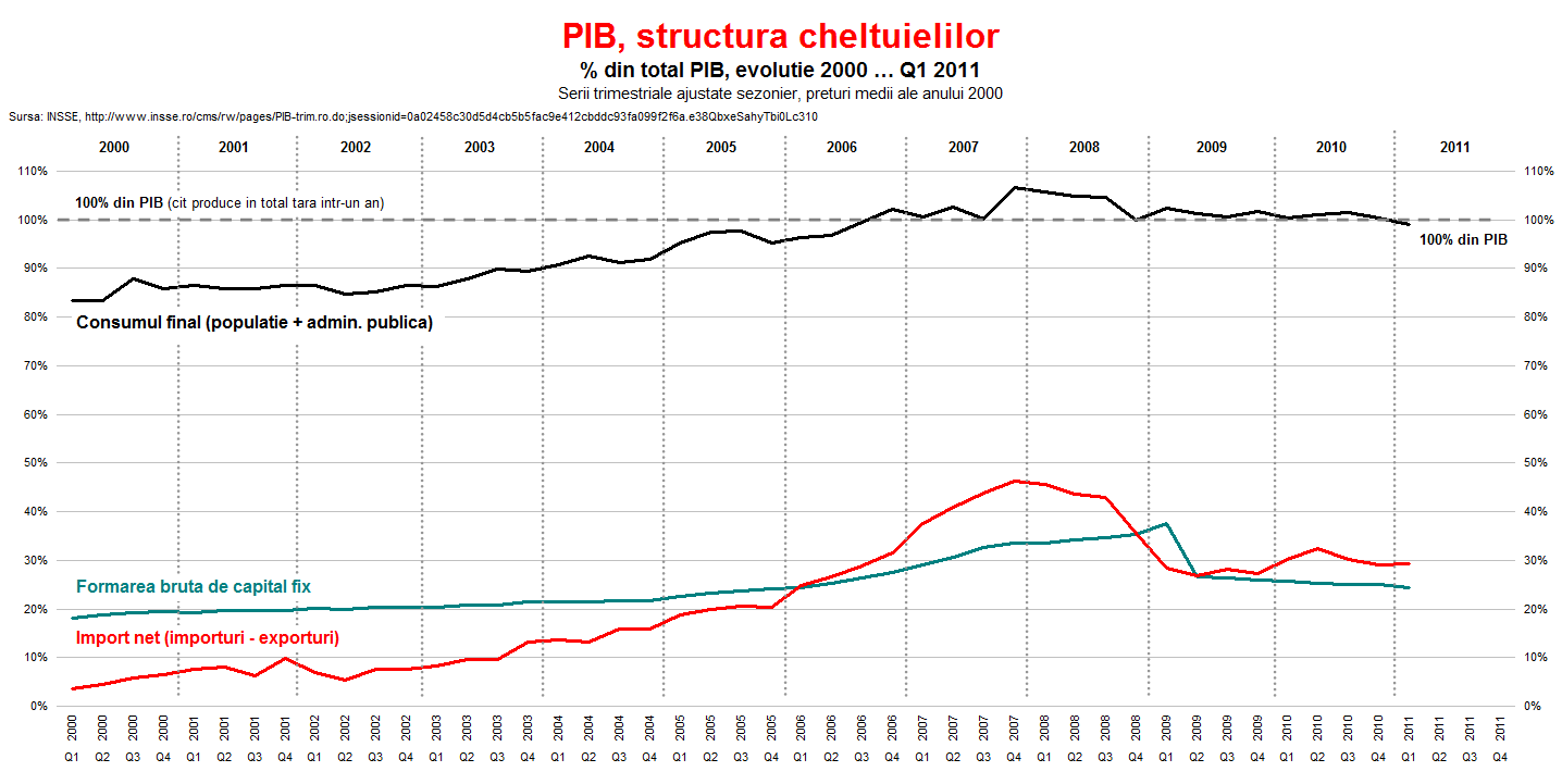 De remarcat din nou, de manierǎ cît se poate de sugestivǎ grafic, ponderea deșǎnțatǎ a importurilor în zona anilor 2007 – 2008, exact cînd și consumul ajunsese la paroxism. Cum ar veni: de prin 2005 2006 încoace am adus bani din alte țǎri tot într-o veselie, deci ne-am împrumutat, ca sǎ-i consumǎm, nu ca sǎ facem ceva durabil cu ei.