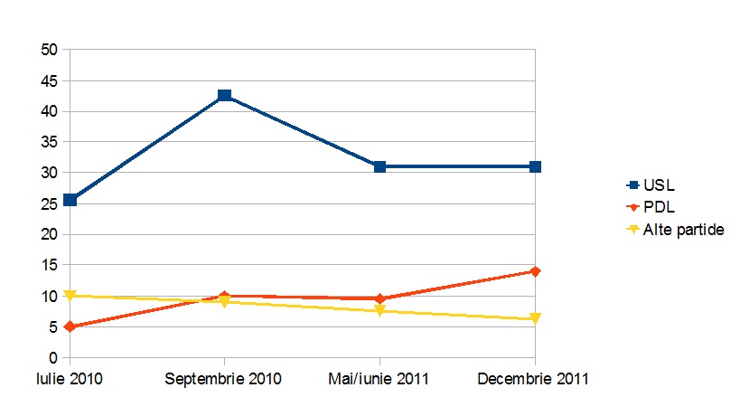 A: PSD şi PNL şi-au atins punctul maxim în septembrie 2010, iar USL a pierdut masiv în iarna anului 2011 (după cum arată şi graficele de mai sus), adică exact atunci existenţa alianţei a devenit un lucru cert.