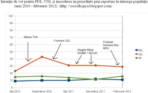 Cu roşu, linia cea mai de sus: scorul USL, până în mai 2011: suma partidelor componente. Cu verde: % de cetăţeni care aveau sau au încredere mare sau foarte mare în Traian Băsescu. Cu albastru: scorul PDL.