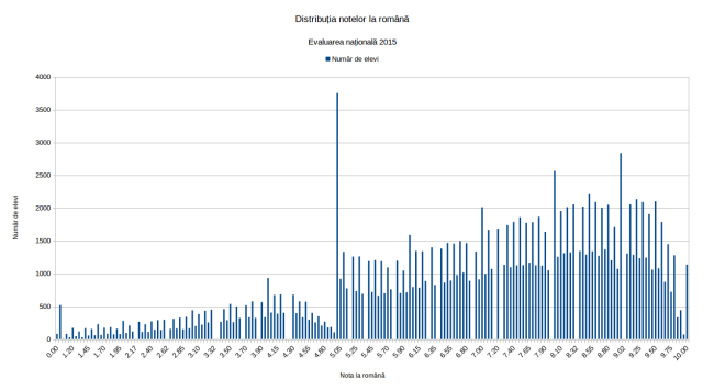 5. imediat înainte de nota 5 se observă o scădere bruscă a numărului de note, compensată de creșterea bruscă a bățului corespunzător notei 5. În mod evident, mulți corectori au trăit cu impresia că este un concurs la care nota de trecere este 5;
