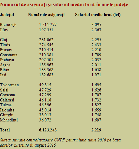 Astfel, pe luna iunie 2016 ( pentru care s-au prelucrat datele disponibile), salariul mediu brut rezultat prin împărțirea fondului de salarii taxat de 13,59 miliarde lei la cei 6,123 milioane de angajați existenți în evidențele CNPP (interesantă și diferența față de numărul de angajați de circa 4,7 milioane anunțați de INS, dar acela este valabil pentru firmele care au peste 4 salariați) a fost de 2.219 lei. De reținut, 2.219 lei BRUT.
