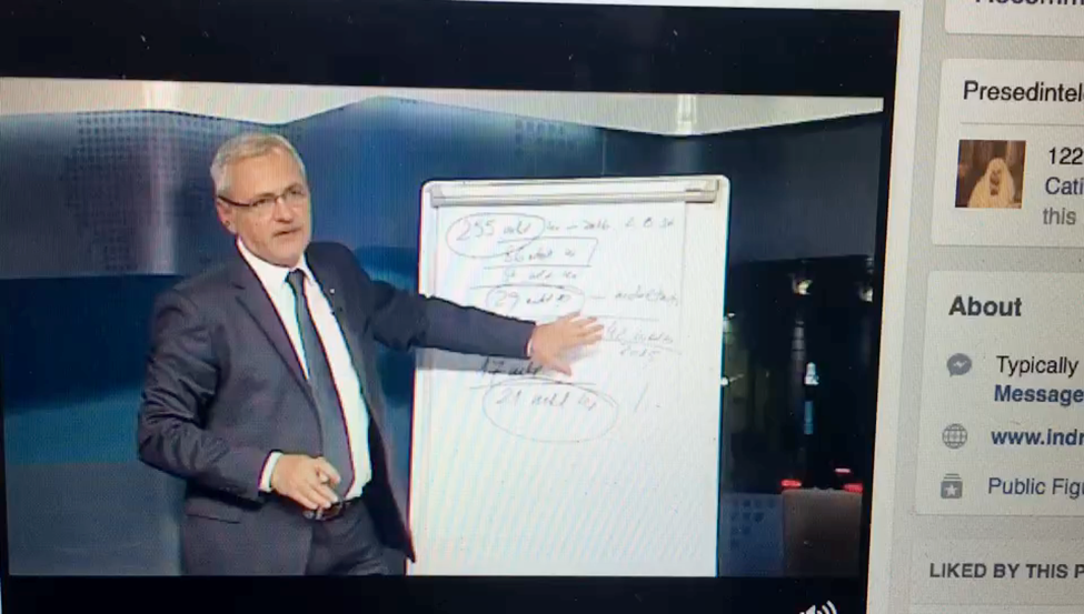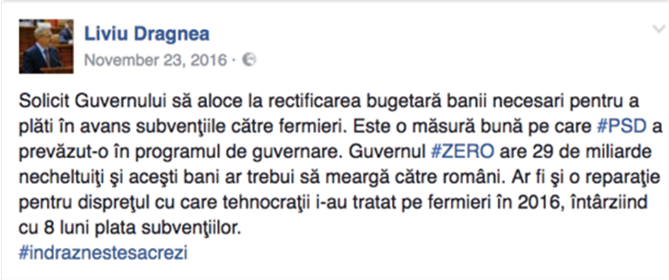 Tot pe 23 noiembrie 2016 domnul Liviu Dragnea posta pe Facebook inregistrarea emisiunii din 22 noiembrie la B1 TV, realizator Silviu Manastire unde spunea, cu exact o zi inainte de anuntarea rectificarii bugetare: “Au avut programul de dezvoltare locala pornit de mine. L-au stopat in Septembrie dupa ce se cheltuisera toti banii 3 miliarde, au deja facturi de 1.3 miliarde. Sper sa le dea banii. Si mai pot face ceva. Sa aduca cheltuieli de anul viitor anul asta. Sa pot plati toata subventia pentru fermieri in avans.”