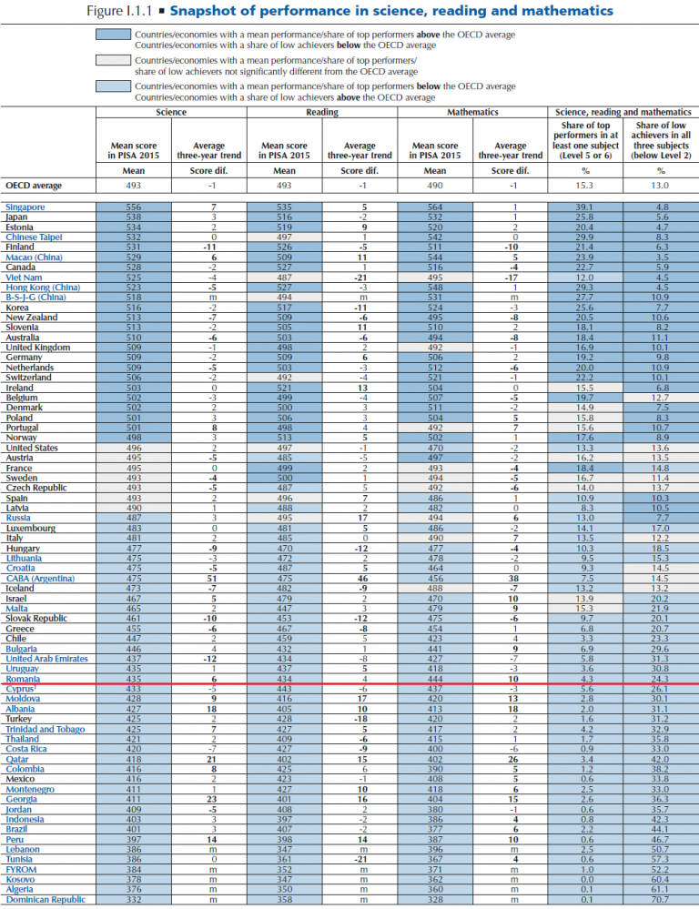 România și Cipru sunt statele UE cel mai prost plasate în clasament, la aceste teste la care au participat 540.000 de elevi, reprezentativi pentru cei 29 de milioane de tineri de 15 ani care învață în școlile din 72 de țări: