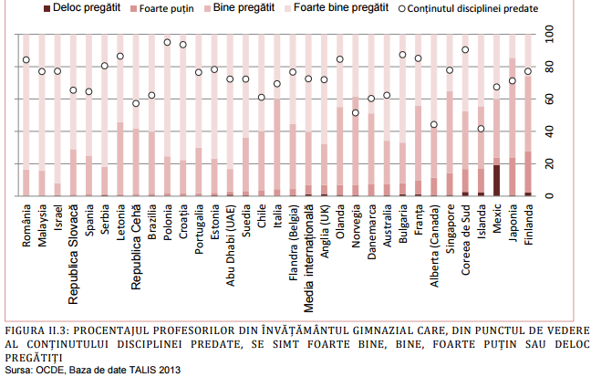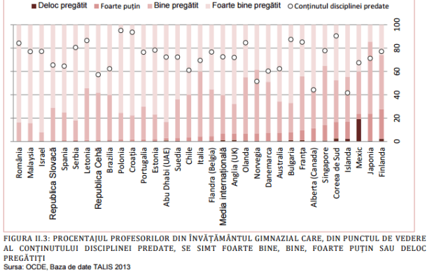 Ultimul Studiu Internațional privind Procesul de Predare – Învățare (TALIS, realizat de OECD) arăta că profesorii din România, alături de cei din Malaysia, se cred cel mai bine pregătiți dintre profesorii din cele 34 de țările participante la acest studiu OECD – 99,8% dintre profesoriri români se simt bine sau foarte bine pregătiți în ceea ce privește conținutul disciplinei predate, iar 98,5% dintre profesori se simt bine sau foarte bine pregătiți în ceea ce privește pedagogia disciplinei predate.