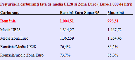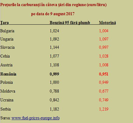 La momentul actual, potrivit datelor oficiale publicate de Comisia Europeană pe 31 iulie 2017, ne aflam pe locul 2 în clasamentul ţărilor cu cea mai ieftină benzină, cu 1,00451 euro/litru ( după Bulgaria) şi pe locul 5 la motorină, cu 0,99351 euro/litru ( după Luxemburg, Letonia, Bulgaria şi Lituania).