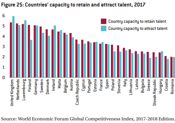 Potrivit unui studiu realizat de Bruegel, think tank specializat pe economie, România se află în 2017 pe ultimul loc în clasamentul capacității statelor membre de a păstra și de a atrage talente (personal înalt calificat).