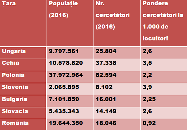 România este singura țară din regiune care a înregistrat o scădere a numărului de cercetători, în perioada 2005 – 2015. În timp ce în Ungaria, numărul acestora a crescut cu 59%, în România, efectivele de astfel de angajați s-au prăbușit cu 24%. Evoluția numărului de cercetători, în regiune, perioada 2005 – 2015: