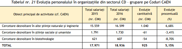 - Domeniul cercetării-dezvoltării în biotehnologii continuă trendul de scădere a numărului de CIM (-8,70% în perioada 2017-2016, după -8,00% în perioada 2015-2016). La nivelul anului 2017 acest subdomeniu înregistra de 27 de ori mai puțini angajați decât subdomeniul științelor naturale și inginerești, și de aproape 3 ori mai puțini angajați decât domeniul științelor sociale și umaniste, cu toate că biotehnologiile reprezintă un sector strategic de inovare, dezvoltare tehnologică și valoare adăugată în cadrul Strategiei naționale de competitivitate a României.