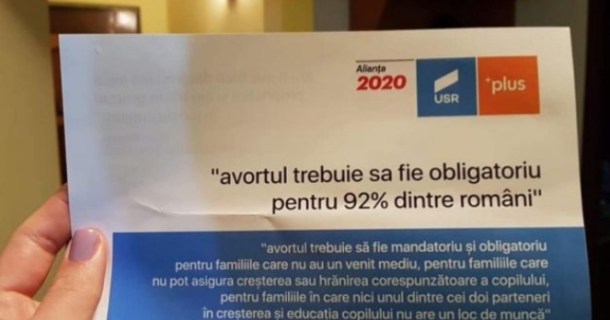 1. În comunicatul senatorului USR Goțiu s-a strecurat o minciună prin omisiune: adevărat, pliantele nu au fost emise de către Alianța 2020. Dar ceea nu se spune este că, vorbind despre conținut, acesta este întru totul real; iar citatul conform căruia 92% dintre români nu ar fi indicat să aibă copii, ci ar fi preferabil să recurgă la avort, aparține unui influencer USR, fără îndoială.