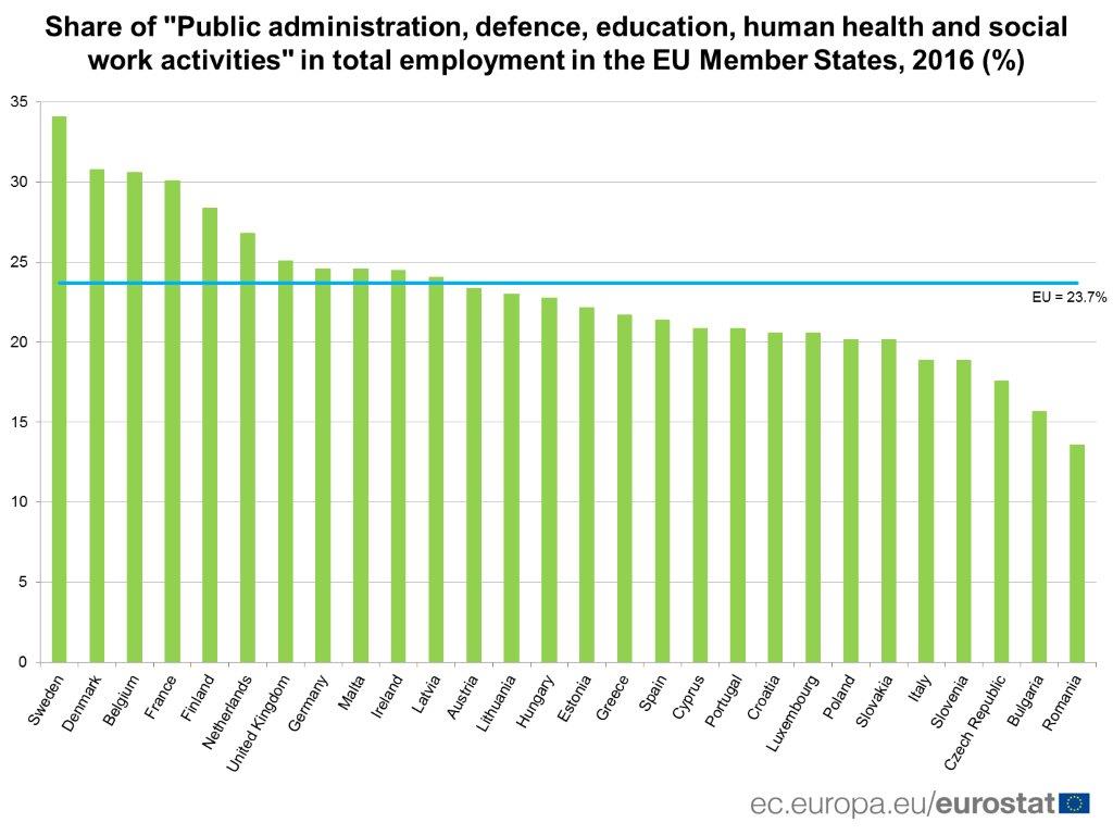 Potrivit Eurostat, pe primele trei trimestre din 2017, România avea o pondere a bugetarilor în total salariați de 19%, mai puțin decât media europeană, care era de 28%. Cu 19% din agajați, bugetarii români aduceau la indicatorul numit Valoare Adăugată Brută (VAB, care este un fel de productivitate a muncii exprimată la nivel european) 13% din totalul VAB din economie, adică exact cât produceau, proporțional, bugetarii europeni care, la media de 29% dintre angajați, aduceau un VAB de 19%. De atunci, lucrurile nu s-au schimbat semnificativ.