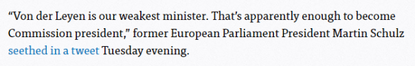 Deci vom avea un președinte de Comisie europeană incompetent, corupt, hoț intelectual. Pe deasupra, amic al lui Putin, căci politca externă germană, căreia doamna Ursula von der Leyen i-a fost promotoare, este una de conciliatorism față de excesele politicii externe ruse. Iar cine acceptă, în final este de acord și sprijină.