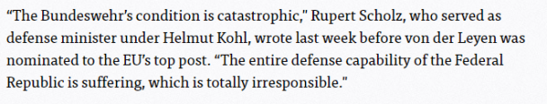Von der Leyen este cea mai criticată ministră a Apărării de la război încoace. În vremea ei, soldații germani au ajuns să facă simulări tactice cu arme adevărate dar strigând „POC”-„POC”, pentru că nu aveau muniția asigurată.