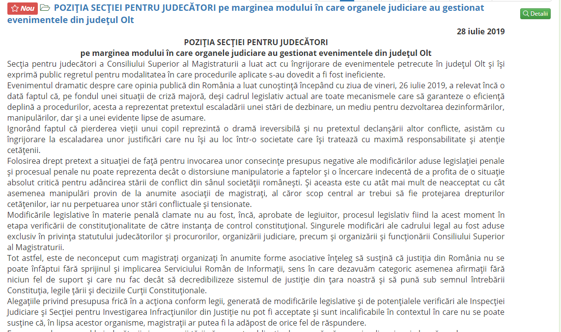 este de neconceput cum magistrați organizați în anumite forme asociative înțeleg să susțină că justiția din România nu se poate înfăptui fără sprijinul și implicarea Serviciului Român de Informații, sens în care dezavuăm categoric asemenea afirmații fără niciun fel de suport și care nu fac decât să decredibilizeze sistemul de justiție din țara noastră și să pună sub semnul întrebării Constituția, legile țării și deciziile Curții Constituționale. /…/ este de neconceput cum magistrați organizați în anumite forme asociative înțeleg să susțină că justiția din România nu se poate înfăptui fără sprijinul și implicarea Serviciului Român de Informații, sens în care dezavuăm categoric asemenea afirmații fără niciun fel de suport și care nu fac decât să decredibilizeze sistemul de justiție din țara noastră și să pună sub semnul întrebării Constituția, legile țării și deciziile Curții Constituționale.