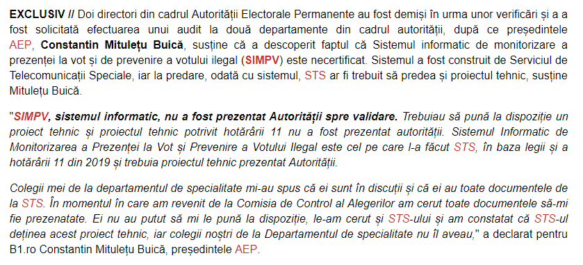 Într-un interviu la B1 TV directorul Autorității Electorale Permanente a făcut o afirmație categorică: alegerile europarlamentare din 2019 au fost asistate de un soft pus la dispoziție de STS (care a și instrumentat, pe partea soft și hard, supravegherea alegerilor, colectarea și centralizarea rezultatelor) – dar respectivul soft nu era și nu este omologat.