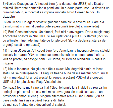 Ceaușescu a fost, din primul până în ultimul moment al regimului său, un dictator comunist. Putem împărți și periodiza perioada în care a condus România, dar să zici că „a început bine” înseamnă să abuzezi de memoria colectivă a românilor: mai binele (în comparație cu perioada de sfârșit a regimului” nu înseamnă bine. Să zici despre un dictator comunist că a guvernat bine înseamnă că ești un cretin spălat pe creier.