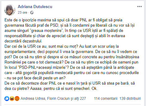 Ei bine, în momentul în care partidele ar trebui să manifeste maxim de responsabilitate, unele făcând un pas în spate iar altele făcând un pas în față, USR se derobează de răspunderea guvernării.