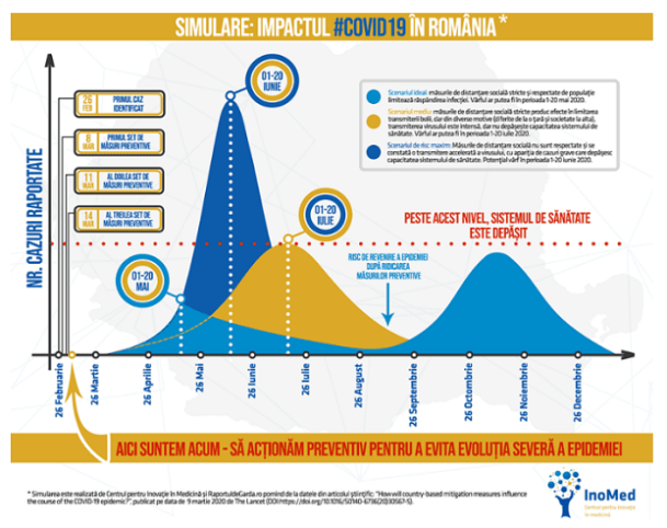 - într-un scenariu mediu (cu o afectare în masă a populației dar fără depășirea capacității sistemului național de sănătate) maximul pandemic va fi atins în prima parte a lui iulie, școlile putând să își deschidă porțile doar undeva la sfârșitul lui septembrie (tot atunci s-ar putea da și examenele naționale – dar fără o pregătire la clasă anteroară susținerii lor)
