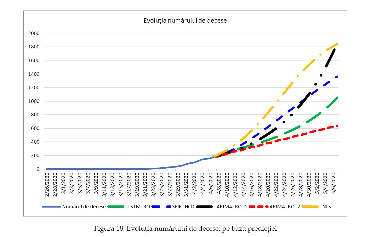 - Scenariul pesimist – conform căruia, în prima săptămână din mai, numărul de decese ar putea ajunge la 1.800-2.000 (modelele ARIMA_RO_1, NLS).