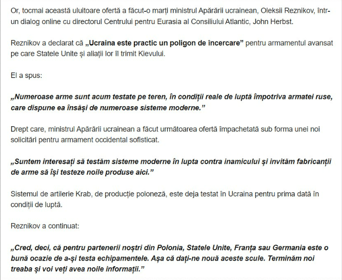 Deci ministrul apărării ucrainean propune ca Ucraina să devină poligon de încercare pentru armamentul de ultimă generație a NATO.