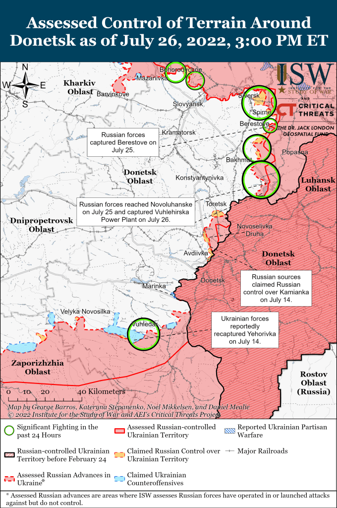 Russian forces continued to fight south of Bakhmut on July 26. Several Russian sources posted further confirmation that Russian forces, including Wagner Group mercenaries, have taken control of the Vuhlehirska Power Plant (also sometimes referred to as the Vuhledar Power Plant) about 25 km southeast of Bakhmut.[9] The Ukrainian General Staff stated that Russian forces are fighting in Semihirya (just northwest of the Vuhlehirska Power Plant).[10] ISW assessed on July 25 that Ukrainian troops likely conducted a controlled withdrawal from the power plant to Semihirya, and Russian forces will likely continue measured attempts to push north of the territory of the plant towards Bakhmut.