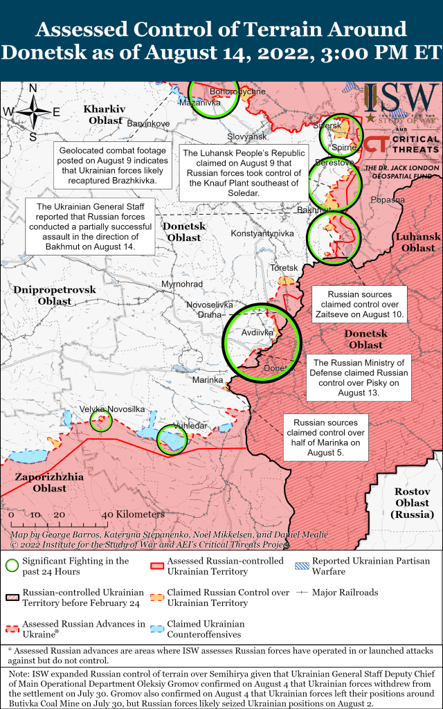 Russian forces conducted ground attacks north and northwest of Donetsk City on August 14. The Ukrainian General Staff reported that Ukrainian troops repelled a Russian attack on Krasnohorivka, about 20km north of the outskirts of Donetsk City.[37] Ukraine’s Eastern Command Spokesperson Serihy Cherevatyi notably contested the Russian Ministry of Defense’s August 13 claim that Russian troops had taken full control of Pisky.[38] Cherevatyi stated that Russian forces are still actively fighting in Pisky and towards Pervomaiske (about 10km northwest of Pisky along the E50 highway), but that Ukrainian troops retain control of the town.[39] Cherevatyi’s assertion is supported by geolocated footage of a Russian strike on a building in Pisky, which suggests that the Russians are still targeting Ukrainian troops within the settlement rather than fully controlling it.[40] Russian sources also claimed that Donetsk People’s Republic (DNR) troops have begun fighting towards Nevelske, just 1km west of Pisky.[41] While Russian forces likely have not cleared the entirety of Pisky, they are likely consolidating their positions in order to launch further attacks westward.