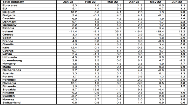 Cu 61,2% au crescut prețurile la poarta fabricii la noi în țară. A doua cea mai lovită de scumpiri piață din UE este Danemarca, cu 55%. Dacă ne comparăm cu concurența noastră directă, din regiune adică, Ungaria are acest indicator la 45%, iar Polonia la 33,6%. Cum, oare mai putem vorbi de competitivitatea companiilor noastre cu asemenea cifre? Media Uniunii este de 36%. În ceea ce privește scumpirea produselor industriale în ultima lună, doar Irlanda ne depășește: