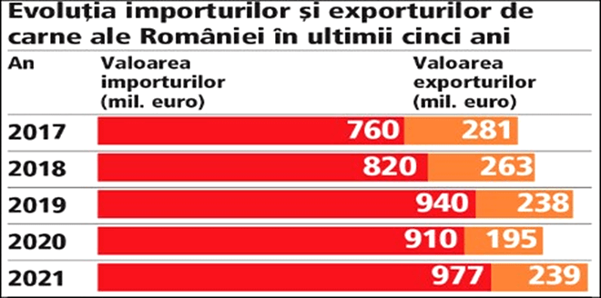 Și pentru a ne lărgi un pic orizontul cunoașterii politice, un mic exemplu de mărfuri la care aflăm cu surprindere că avem un deficit comercial major. Pentru început, uite ce promitea Iohannis încă din 2014, în lucrarea sa de căpătâi, „România lucrului bine făcut”: „În viziunea dreptei românești, modernizarea sectorului agro-rural este de interes național. Pentru ROMÂNIA LUCRULUI BINE FĂCUT, reformarea exploataţiilor agricole, modernizarea spaţiului rural şi deblocarea potenţialului său economic, precum și simplificarea administrativă constituie direcţii clare care vor aduce și beneficiile așteptate. Nu este suficient să conştientizăm că avem un potenţial agricol imens, ci trebuie să facem ca agricultorul român să devină un pion important în arhitectura economiei românești. Este vitală transfomarea agriculturii româneşti într-un motor de creştere economică, prin crearea de locuri de muncă pentru populaţia din mediul rural și prin susținerea performanței și a veniturilor agricultorilor”. Și iată și rezultatul : am ajuns, în 2021, la un deficit de aproape 5 miliarde de euro la comerțul cu produse alimentare (sursa aici)! România importă carne în valoare de 1 miliard de euro și exprtă cu 740 de milioane de euro mai puțin. Citiți, vă rog, în oglindă, promisiunea din cărticica roșie a lui Iohannis și tabelul comerțului exterior cu carne: