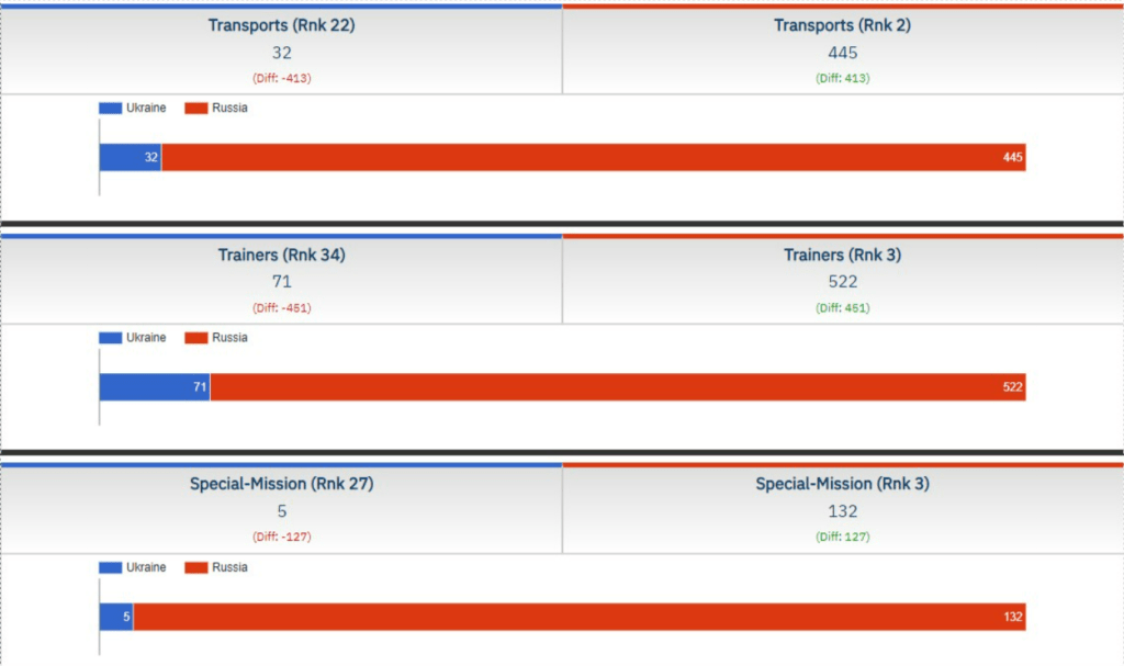 Între timp, desigur, cifrele s-au schimbat. Ucraina a pierdut cea mai mare parte a aviației proprii, care a fost parțial înlocuită cu aparate venite din fostele state comuniste, compatibile cu experiența piloților ucraineni, dar și cu unele aparate noi (dar nu avioane moderne). Tabelele nu iau în considerație dronele, unde dacă nu numeric dar atunci calitativ forțele armate ucrainene sunt egale dacă nu superioare celor rusești.