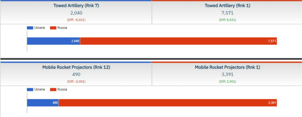 Pe de altă parte, mai ales în ultimele două luni, Ucraina a primit numeroase elemente de artilerie (în special faimoasele lansatoare de rachete de mare precizie, HIMARS, precum și artilerie grea, din SUA și alte state sponsor). Totuși, pe linia frontului, se pare că superioritatea în artilerie a rușilor este netă, în unele zone chiar de 10:1, în timp ce loviturile ucrainene se bazează pe HIMARS în privința loviturilor în adâncime.