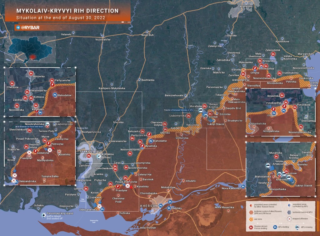 Datorită unor probleme personale, acest articol va fi realizat până la sfârșitul zilei de 30 și postat în dimineața de 31 august. Între timp, în cursul nopții, pot apărea schimbări majore – pe frontul din Kherson sau alte fronturi. Ca și ieri, am folosit surse ruse exclusiv, deoarece Ucraina a impus o tăcere absolută asupra evoluției războiului în Kherson – toate informațiile sunt considerate secret de stat.