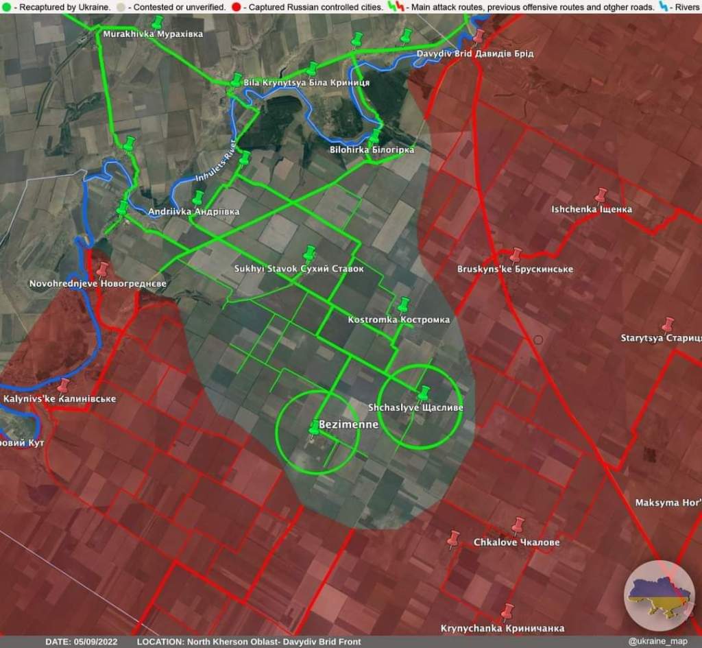 In the grand scheme of things, it looks like Ukraine is attempting to push through the Davidyv Bryd (Inhulets River) bridgehead and toward the Dnieper, thus forcing the Russian forces between their position and Kryvyi Rih to either retreat south toward Kherson or face being cut off from the main Russian grouping.