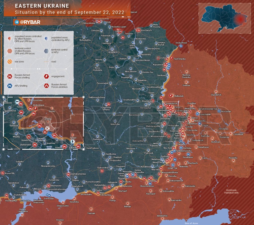 Formațiunile ucrainene dezvoltă o ofensivă împotriva pozițiilor Forțelor Armate Ruse de pe malul estic al râului Oskol. Sarcina cheie este capturarea lui Liman, Svatovo și o ofensivă în adâncul Republicii Populare Lugansk.