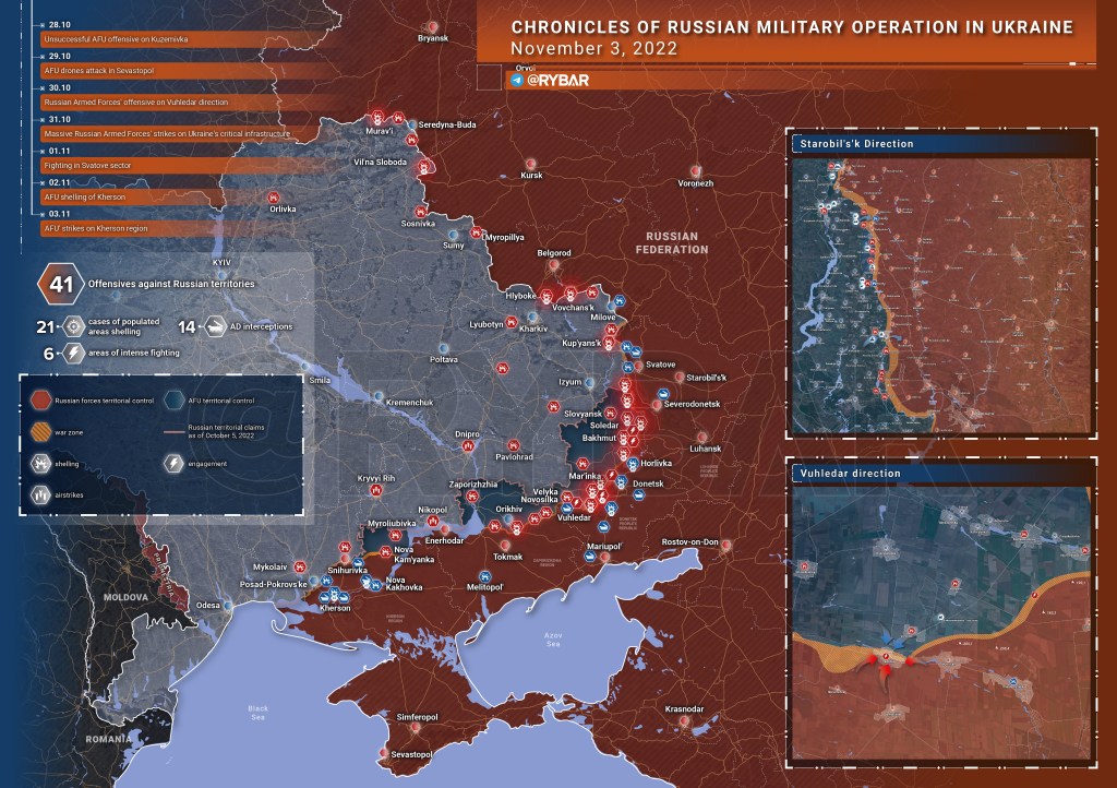 Surse ruse au susținut că forțele ucrainene au continuat să desfășoare operațiuni contraofensive în direcția Svatove și Kreminna pe 3 noiembrie. Ministerul rus al Apărării (MOD) a susținut pe 3 noiembrie că forțele ruse au respins un asalt ucrainean la nord-vest de Svatove în direcția Novoselivske, Regiunea Luhansk (14 km nord-vest de Svatove).[18] Adjunctul șefului statului major ucrainean Oleksi Hromov a raportat pe 3 noiembrie că forțele ruse au lovit pozițiile ucrainene în Novoselivske.[19] Surse ruse au susținut că unitățile de artilerie rusă au respins formațiunile ucrainene care au încercat să avanseze spre Kreminna.[20] Un milblogger rus a susținut că forțele ruse au lovit preventiv forțele ucrainene care se pregăteau să lanseze un asalt la vest de Kreminna de la Yampolivka (17 km vest de Kreminna). [21] Ministerul Rusiei a susținut că forțele ruse au respins și atacurile ucrainene la nord-vest de Kreminna în direcțiile Makiivka (22 km vest de Kreminna), Ploshchanka (17 km vest de Kreminna) și Chervonopopivka (6 km nord-vest de Kreminna).[22] Un milblogger rus a susținut că atacurile ucrainene la vest de Kreminna intenționau să taie autostrada Kreminna-Svatove și să obțină acces la Kreminna prin sud.[23] ISW nu poate verifica în mod independent afirmațiile Rusiei despre operațiunile contraofensive ucrainene în direcția Kreminnei și Svatove. [22] Un milblogger rus a susținut că atacurile ucrainene la vest de Kreminna intenționau să taie autostrada Kreminna-Svatove și să obțină acces la Kreminna prin sud.[23] ISW nu poate verifica în mod independent afirmațiile Rusiei despre operațiunile contraofensive ucrainene în direcția Kreminnei și Svatove. [22] Un milblogger rus a susținut că atacurile ucrainene la vest de Kreminna intenționau să taie autostrada Kreminna-Svatove și să obțină acces la Kreminna prin sud.[23] ISW nu poate verifica în mod independent afirmațiile Rusiei despre operațiunile contraofensive ucrainene în direcția Kreminnei și Svatove.