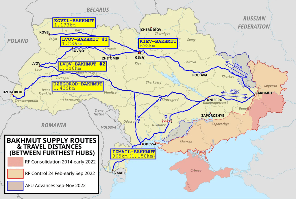 Bakhmut lies at the convergence of two key highway routes feeding Ukrainian ground forces’ front from as far away as Western Europe. These distances are greatest when heading to Bakhmut itself and the AFU’s northern and southern flank extremities in the Donbas. In this vast region of eastern Europe with its notoriously daunting horizons of steppe spread with mostly small settlements, distance acts like a ruthless enemy to both sides. But a quick glance at the maps shows that distance to Bakhmut is particularly cruel to the AFU, conspicuously so out to Bakhmut and its environs.
