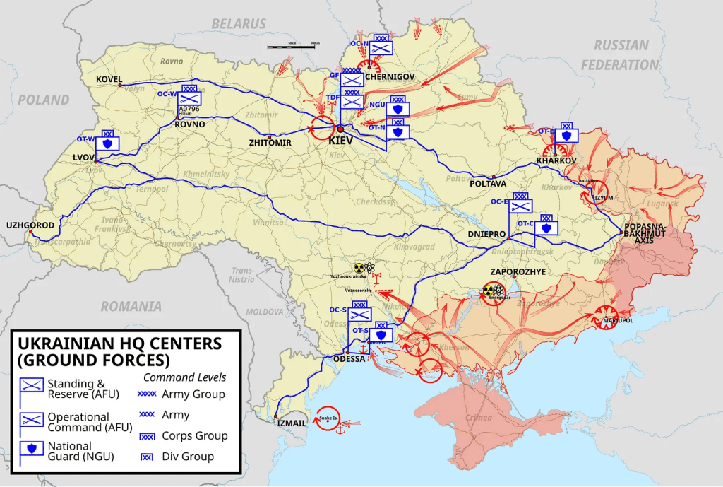 Russia’s north-central array of SMO feint attacks drew and held ten full, first-line Ukrainian brigades at full readiness (called broadly here „line brigades”), plus the equivalent of at least four artillery and rocket brigades. This was in addition to another five territorial brigades already in the process of being brought to strength by local territorial battalions – large Territorial Defence Forces (TrO) already undergoing an initial wave of mobilization since before 24 February. This powerful Ukrainian force was the basis of a yet broader array from fast-mobilized reserve companies, as well as volunteer units, especially ultra-nationalist battalions of the Pravy Sektor, Azov Movement and Karpatska Sich. These latter were incorporated largely into AFU reconnaissance and Special Forces (SSO) formations under Ukrainian Military Intelligence (GUR).