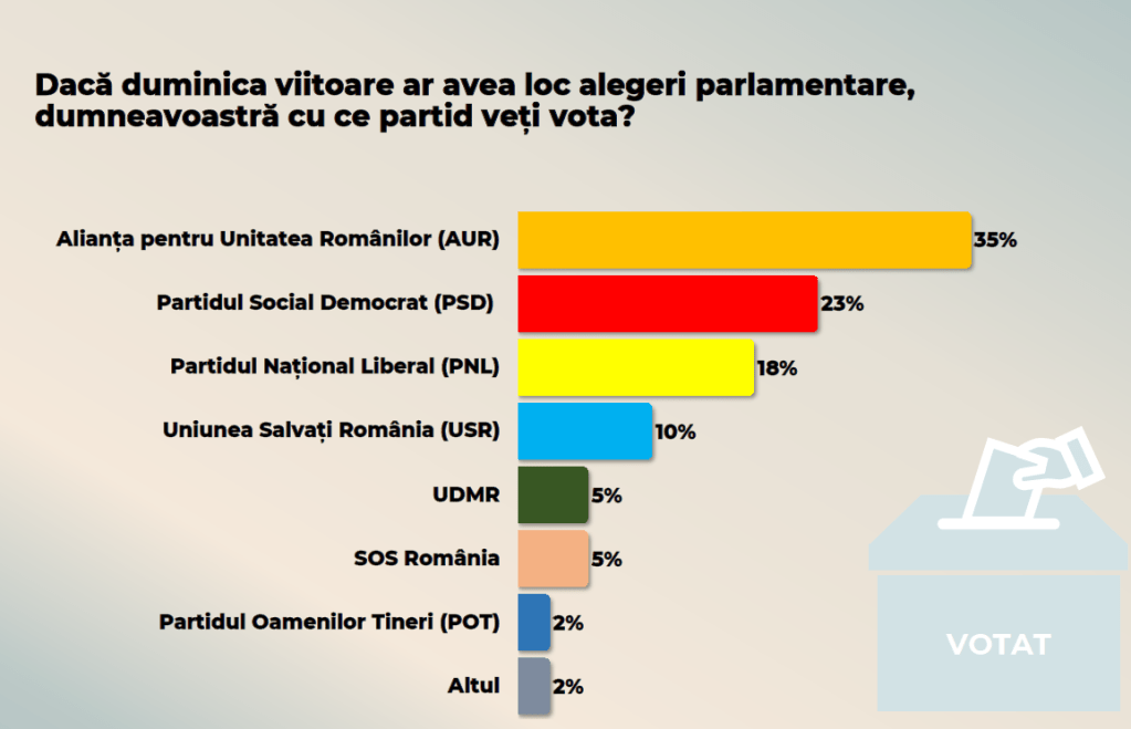 AUR (40,9%): Un partid care a devenit mai mare decât suma „monștrilor sacri” PSD și PNL. Este barosul cu care românul vrea să spargă vitrina unui magazin în care nu-și mai permite să intre.