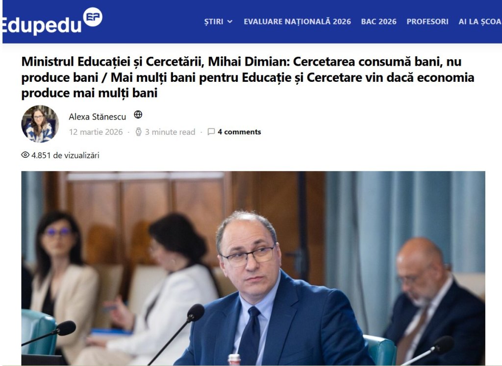 Ministrul Educației și Cercetării, Mihai Dimian: „De fapt, ce așteaptă lumea de la noi nu este cercetare, este inovare. Adică să luăm cunoașterea de la noi sau de la alții și s-o transformăm în bani.”
