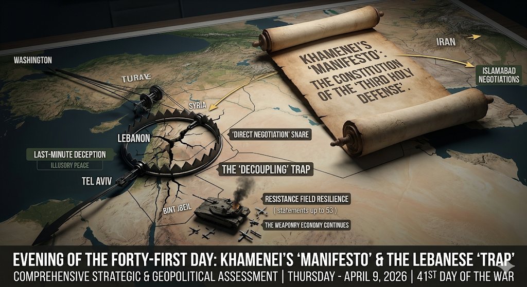 Seara celei de-a 41-a zile: „Manifestul” lui Khamenei schițează liniile de victorie regionale… iar Libanul cade în capcana „decuplării” și în înșelăciunea de ultim moment! — Evaluare strategică și geopolitică cuprinzătoare (joi – 9 aprilie 2026 | Seara celei de-a 41-a zile de război):