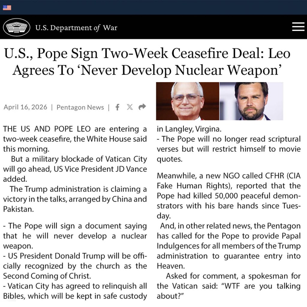 Pentru că e duminică, hai și cu o glumiță. Un fake. Doar că se știe, fake-ul de azi, adevărul de mâine. Și nu, nu este despre Vatican. Ci despre oricare stat care stă, cumva, în calea aspirațiilor către pace și democrație a noului „părinte al popoarelor” și a aliatului său (poate chiar stăpân, cine știe?) pușcăriabilul cu „Marele Israel” în inimă.