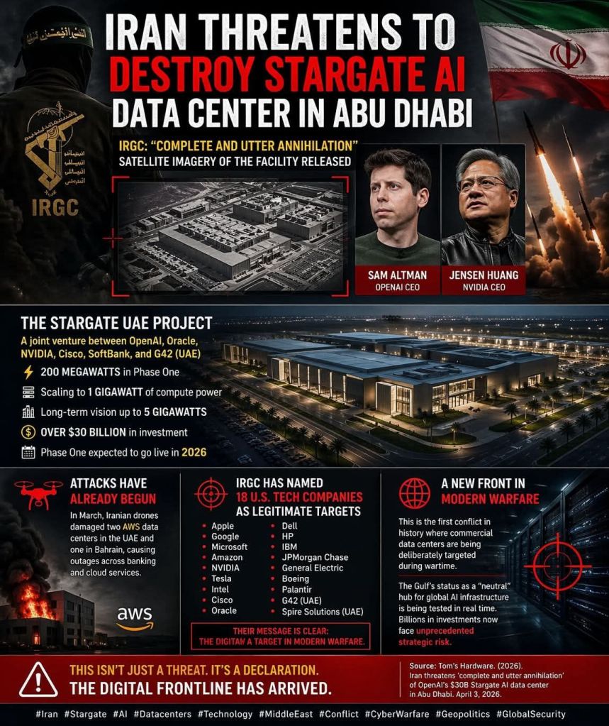 Sursa: Tom’s Hardware (2026) – Iranul amenință cu „anihilarea completă și totală” a centrului de date IA Stargate de 30 de miliarde de dolari al OpenAI din Abu Dhabi.