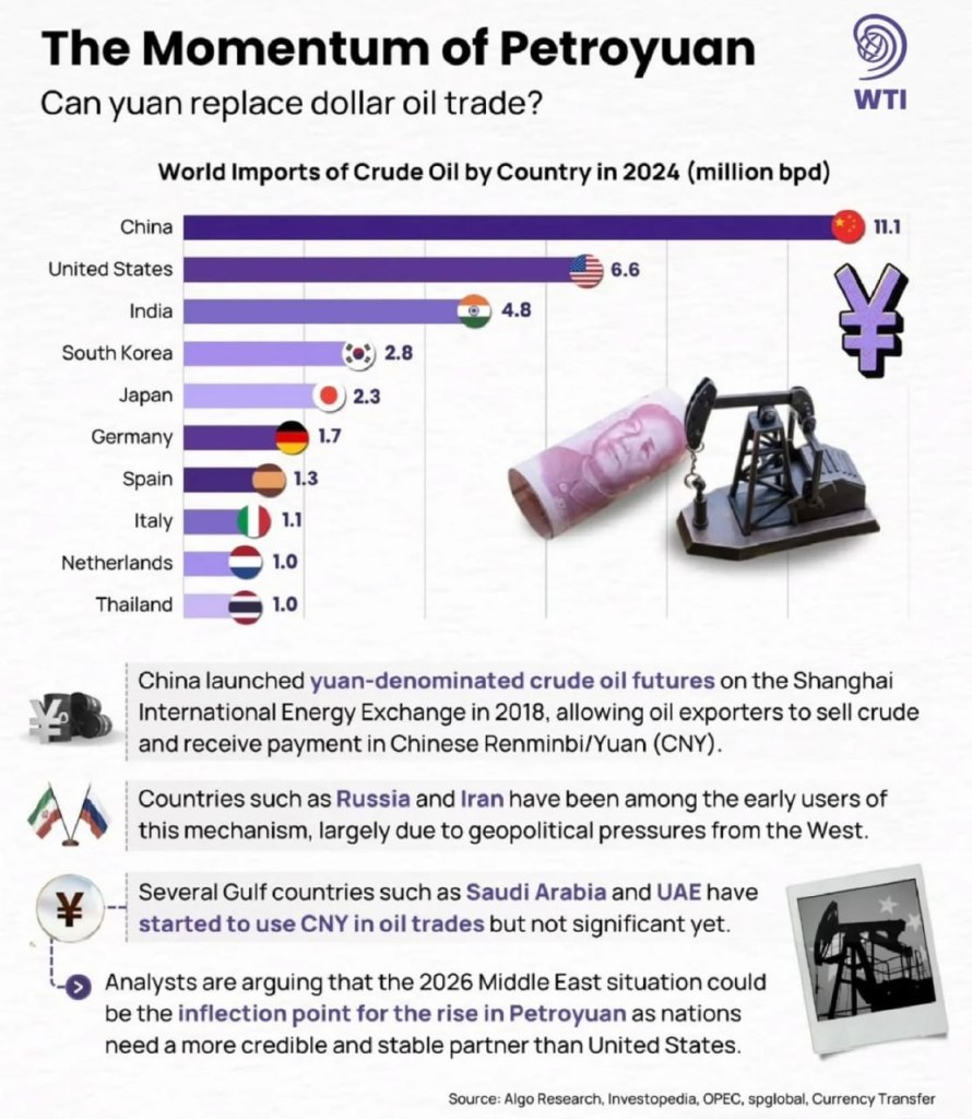 🔸 Rafinăriile indiene deja decontează încărcăturile de petrol iranian direct în yuani, sub presiunea puternică a sancțiunilor SUA. 🔸 Băncile africane construiesc rapid canale directe în yuani pentru a ocoli complet rutarea cu dolari.