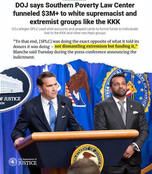 Un exemplu recent este scandalul legat de Southern Poverty Law Center (SPLC). SPLC este o organizație americană cunoscută, prezentată ca luptătoare împotriva extremismului de dreapta și finanțată prin donații masive, de ordinul sutelor de milioane de dolari.