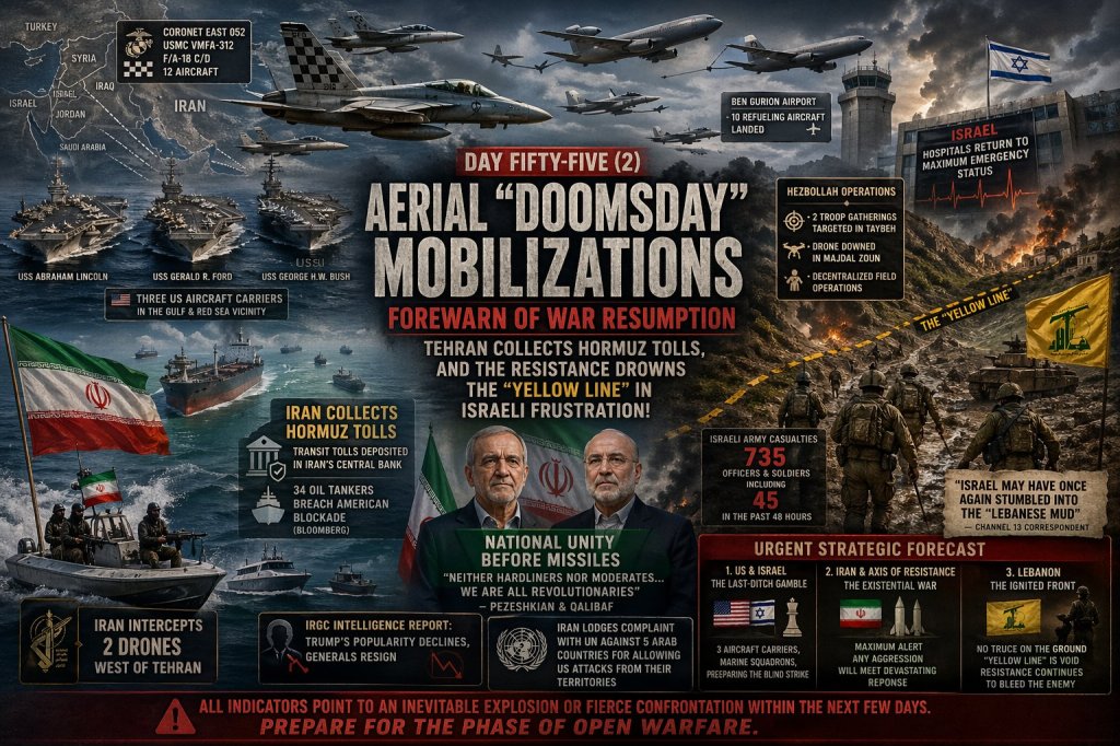 Prognoză Strategică Urgentă: Toți indicatorii (militari și civili, cum ar fi închiderea fizică a școlilor) indică o explozie inevitabilă sau o confruntare foarte acerbă în următoarele zile. Trump este în criză internă și externă, iar Netanyahu se îneacă în noroiul Libanului și este hărțuit de scandaluri. Ar putea recurge la un „noroc” militar pentru a scăpa de eșecul diplomatic, dar răspunsul iranian (care a fost testat în al Treilea Război) va fi și mai letal. Toate părțile, în special baza de sprijin a Rezistenței, trebuie să fie pe deplin pregătite pentru faza „războiului deschis”.