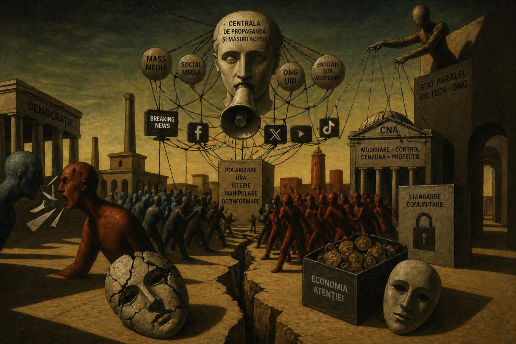 În același timp, funcția critică de filtrare, echilibrare și moderare a jurnalismului profesionist și a intelectualității publice nu doar că nu mai este exercitată, ci este sistematic neutralizată, fie prin campanii de propagandă si intimidare, fie prin mecanisme de control la interfața dintre platforme și structuri de tip stat paralel-NGO sau instituții precum CNA. Și asta e prezentat într-o manieră profund manipulativă ca exercitarea unei funcții de moderare.