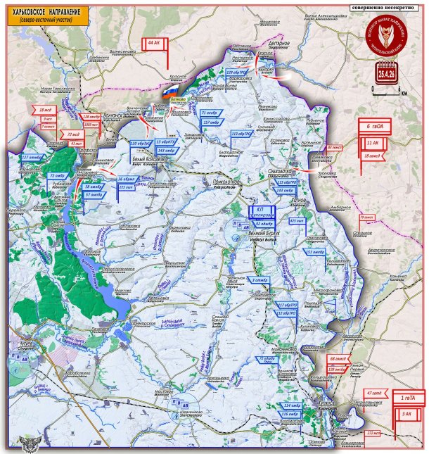 Pe sectorul Volchansk din direcția Harkov, de la așezarea Zybino până la așezarea Degtyarnoe, Forțele Armate Ruse împing inamicul pe malul stâng al râului Volcea și dezvoltă un cap de pod între linia frontierei de stat și malul drept al râului. Râul Volcea este un obstacol natural pe axa înaintării grupării ruse în spațiul operațional. Inamicul, bazându-se pe râu, a creat o serie de centre defensive pe ambele maluri în zonele așezărilor Pokalyanoe, Karaichnoe-Volokhovka, Bochkovo-Chaiykovka, Okhrimovka-Varvarovka și Nesternoe-Budarki. După distrugerea acestor centre defensive, consolidarea malului stâng și stabilirea unor puncte de trecere stabile pentru aprovizionare și manevră, vor fi create condițiile pentru începerea operațiunilor la scară largă pe partea de nord-vest a triunghiului Degtyarnoe-Volchansk-Olhovatka.