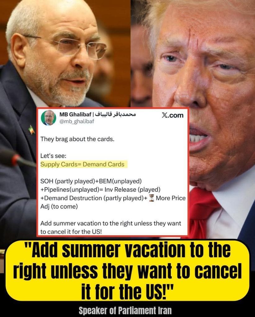 „Cărți de aprovizionare = Cărți de cerere” Aceasta este teza centrală a tweet-ului. Ghalibaf susține că impasul energetic este perfect echilibrat, Iranul controlează partea de ofertă a ecuației, în timp ce SUA sunt blocate să gestioneze partea de cerere. Ambele părți au un avantaj. Niciuna nu are o victorie clară.