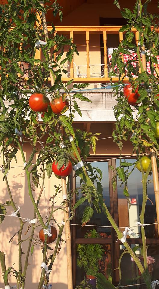 Spatele casei, terasa 2. În curând castraveții vor oferi primele fructe spre recoltare, roșiile au deja gogonele. Vegetația este cam deasă, dar sper că până la urmă totul va fi în regulă.
