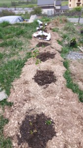Șirul de mure, zmeură și afine. Unele puse astă toamnă, altele în această primăvară. Teoretic ar trebui să se prelungească pe toată aripa din dreapta a proprietății, de-a lungul gardului (care încă nu există). Nu toți lăstarii au prins, iar cei care au prins sunt destul de timizi. Am așternut în jurul lor un strat gros de mulci din gazon tuns, pentru a combate buruienile.